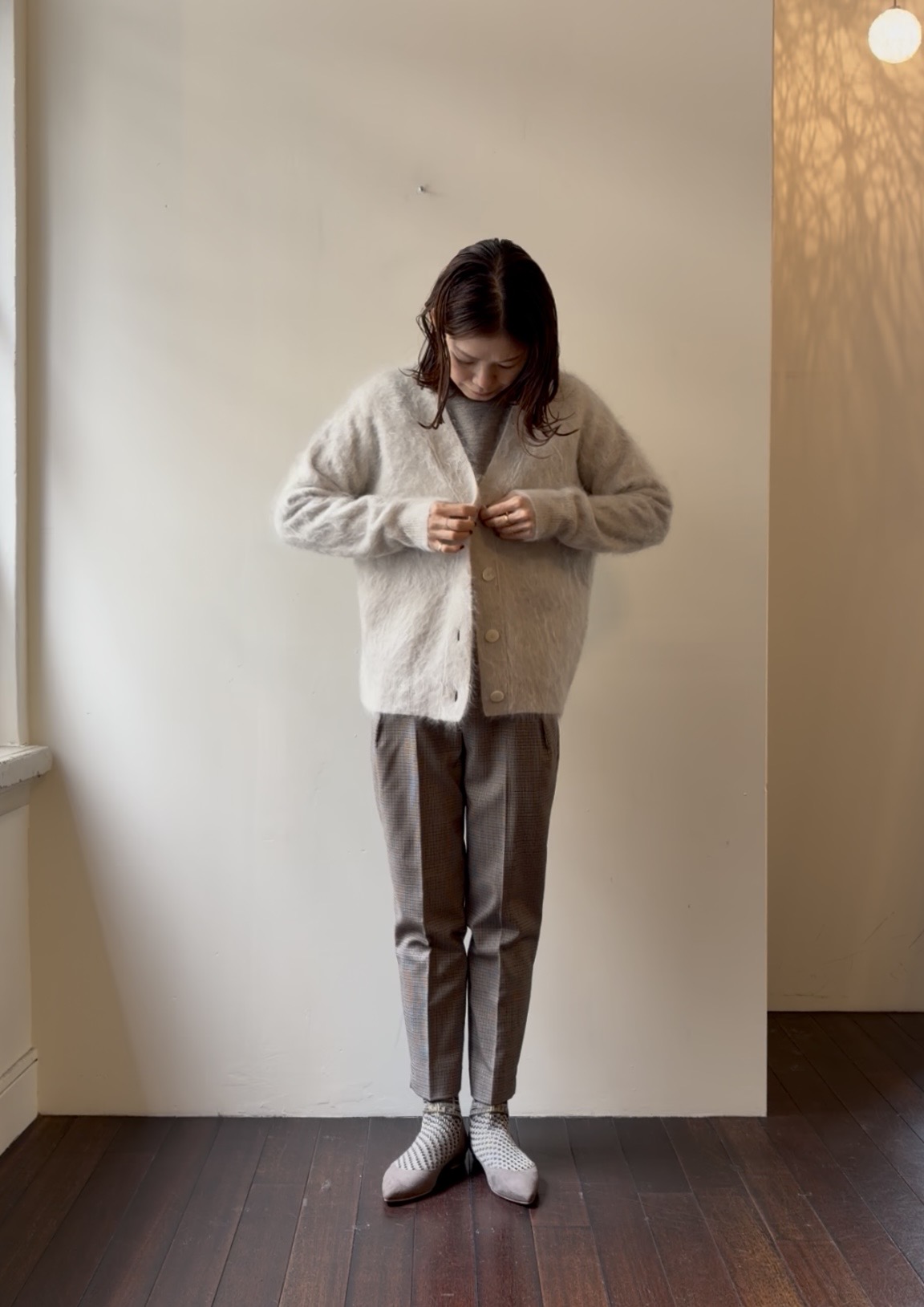 ふんわり毛足の長いカーディガンを羽織って。