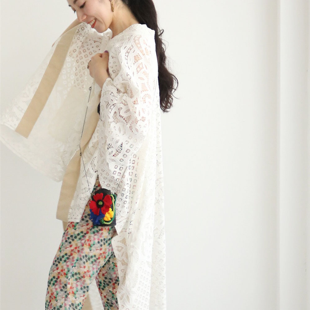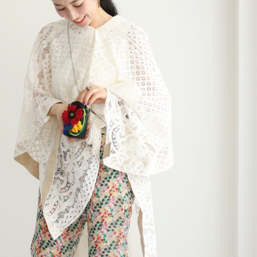ブログ着用のレースのポンチョ、エバゴスのミニバッグ、パンツは