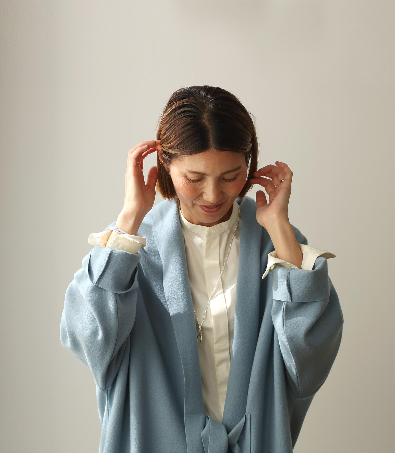 曖昧な季節にコートのような羽織ものを。
