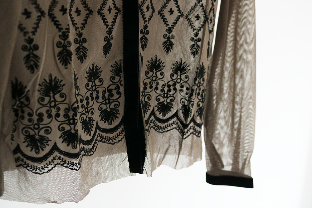 レースのような柄がフロックプリントされたカーディガン型のトップス。