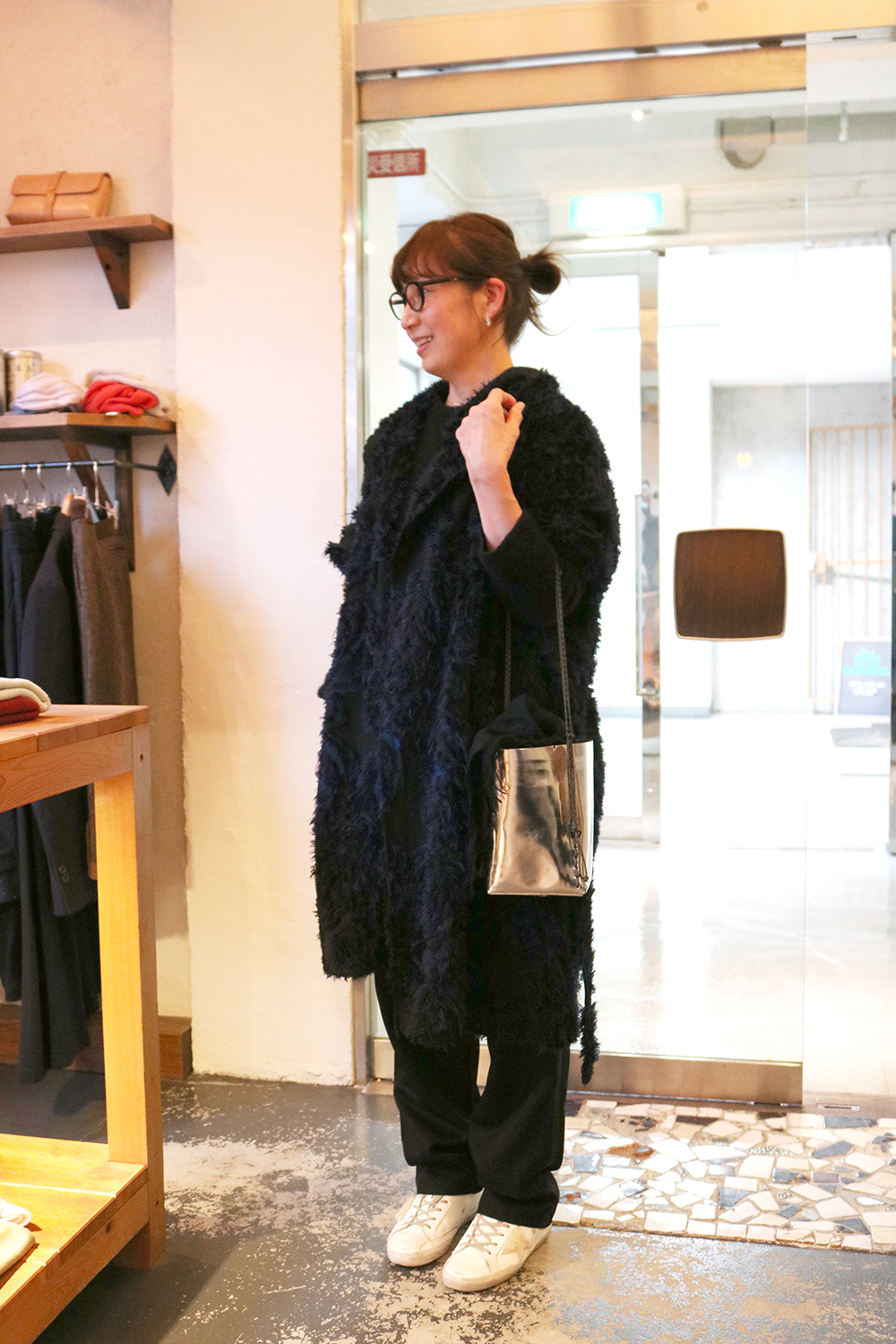 白のスニーカーに、素材感が印象的なコート