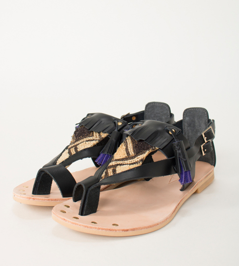 一つづつ、色と柄を合わせて、サンダルに仕立てたこちらの一足。