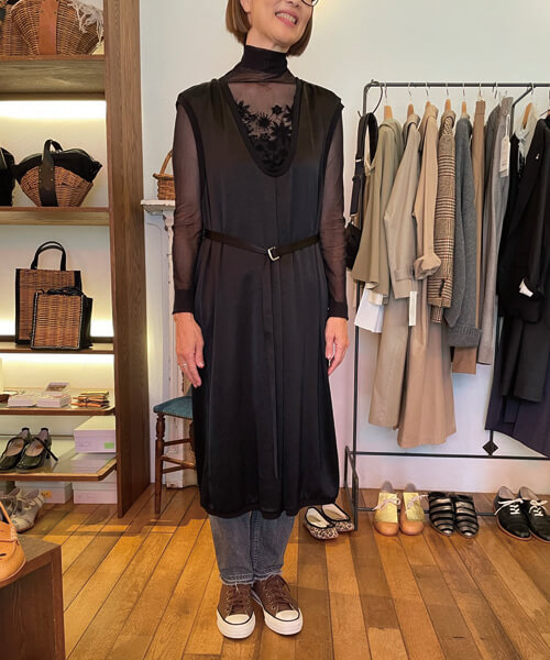 「このワンピースのつるんとした素材感と