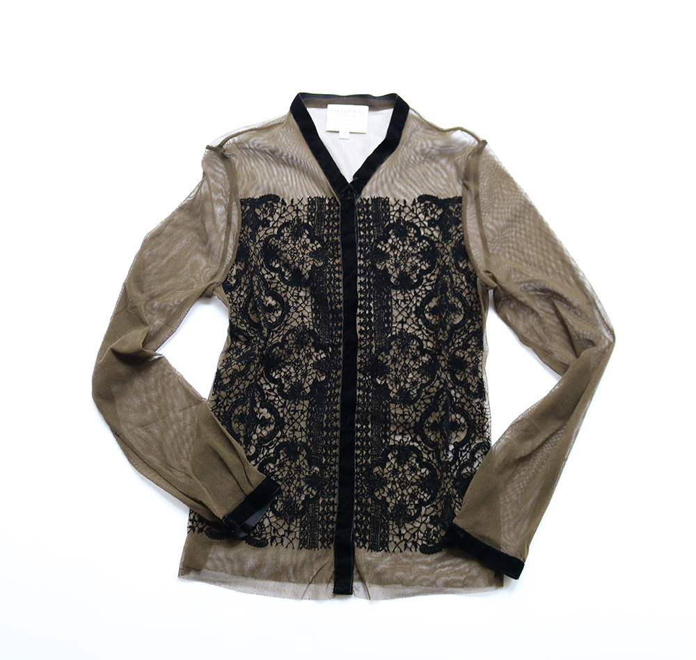 レースのような柄がフロックプリントされたカーディガン型のトップス。