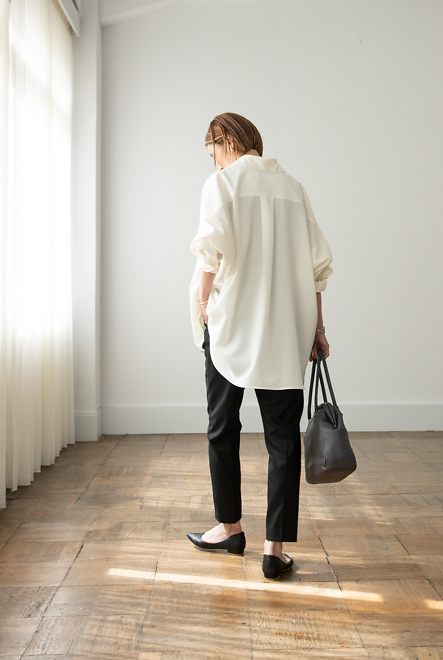 後ろ姿には、ヨークの下にタックがデザインされていて