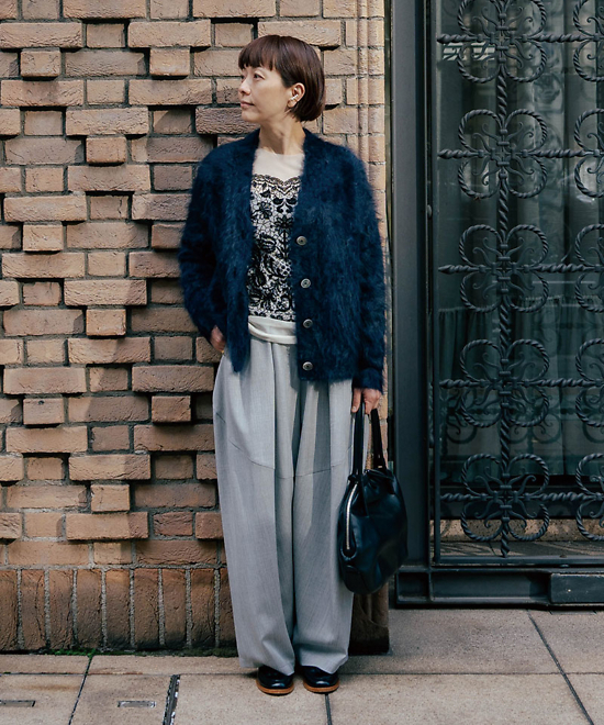 「フロックカットソー」「ドルフィンパンツウール」「もちかたバッグ」モデル身長159cm