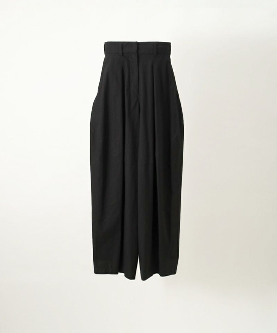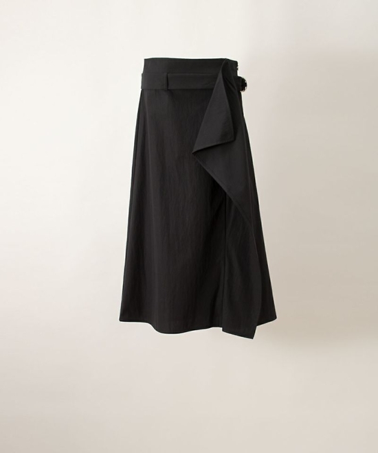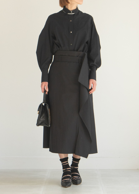 スカート自体のバランスはシンプルですが、左脇のデザインポイントとウエストベルトのディテールから、ボトムスでスタイリングポイントになってくれるようなスカートになっています。