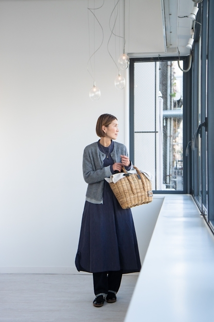 大きめのかごバッグを持って。