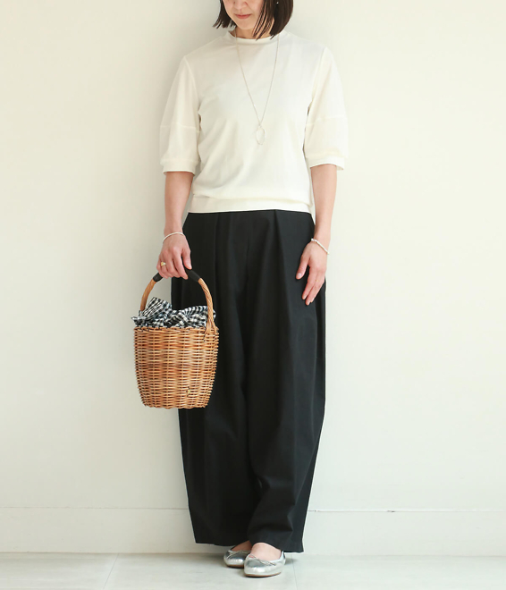 「パフスリーブカットソー 5分袖 」オフホワイトはコットンベースの少しだけ張りのある生地で、程よくつまった首回りが上品なカットソーです。