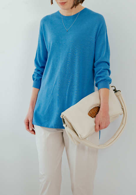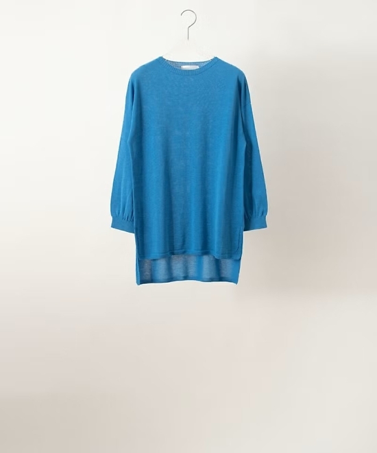 「シャンピニオンニット」は薄めに編み上げられているため春から夏の終わり、夏の名残のある秋初めまで長くご着用いただけるセーターです。