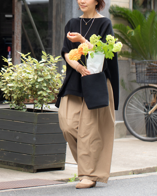 「ドルフィンパンツ」「リーフレットペタスエード」(すべてsoutiencollar)「バッグ」(tocit)モデル身長159cm