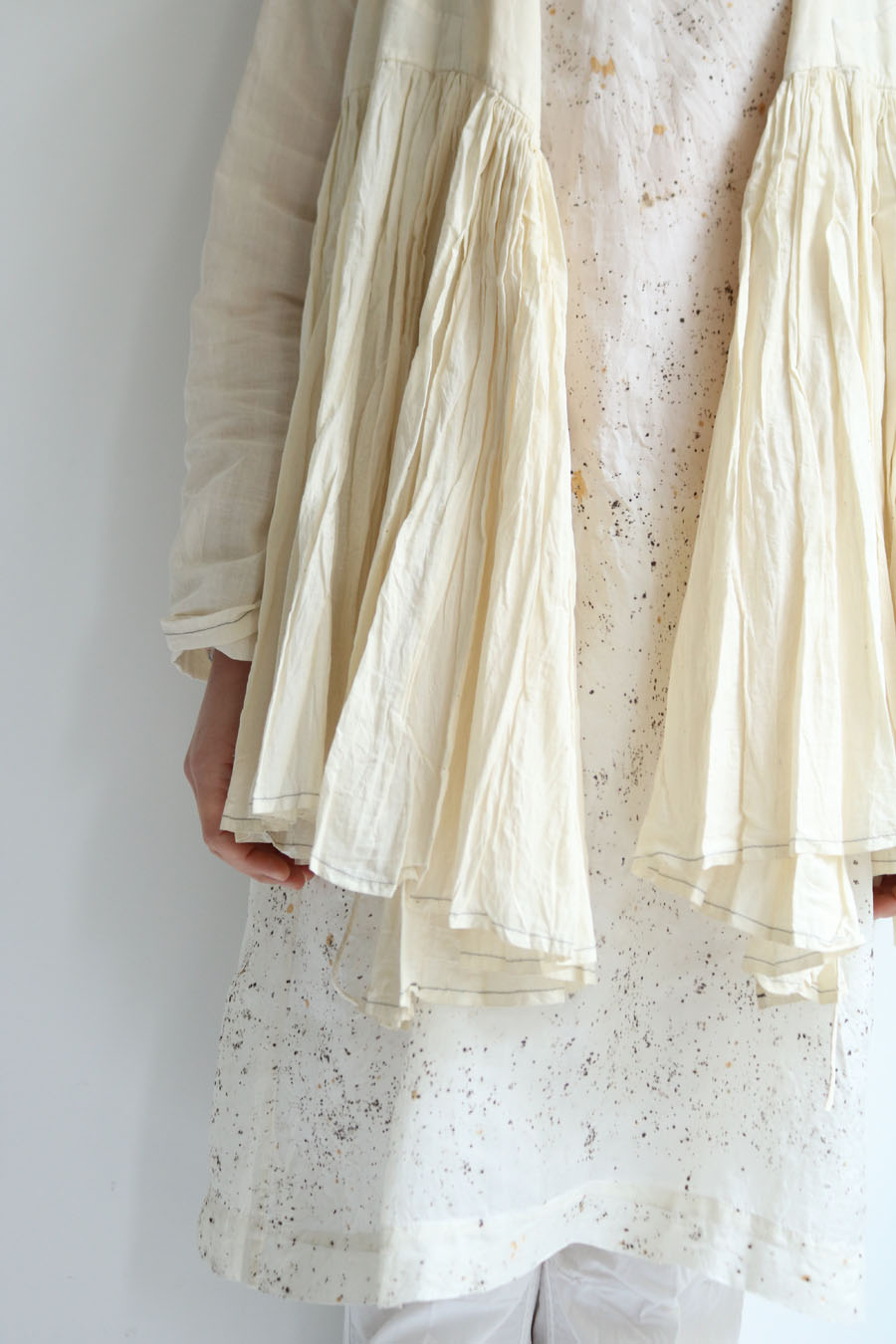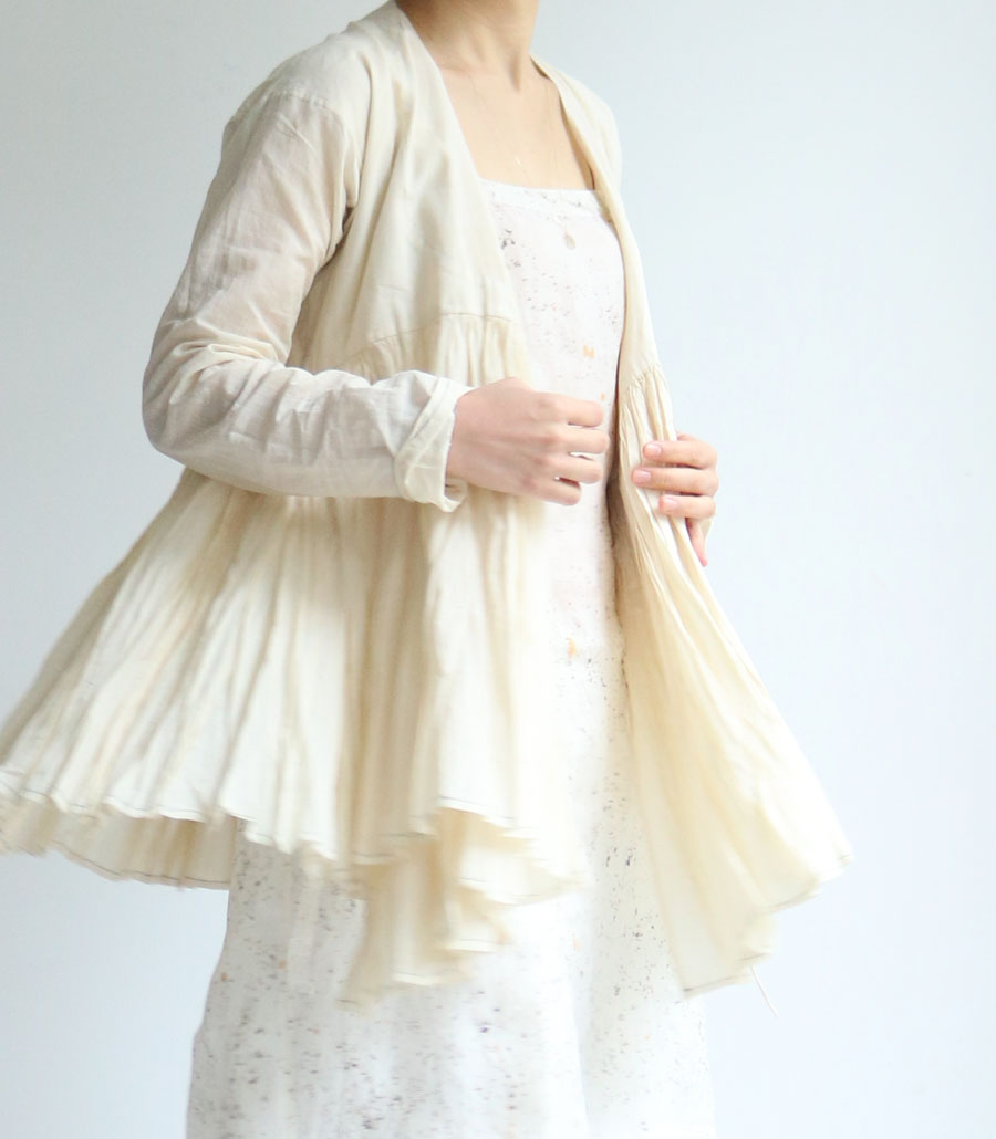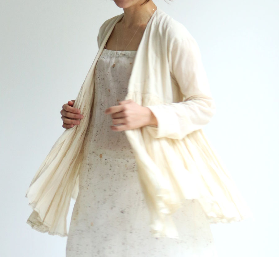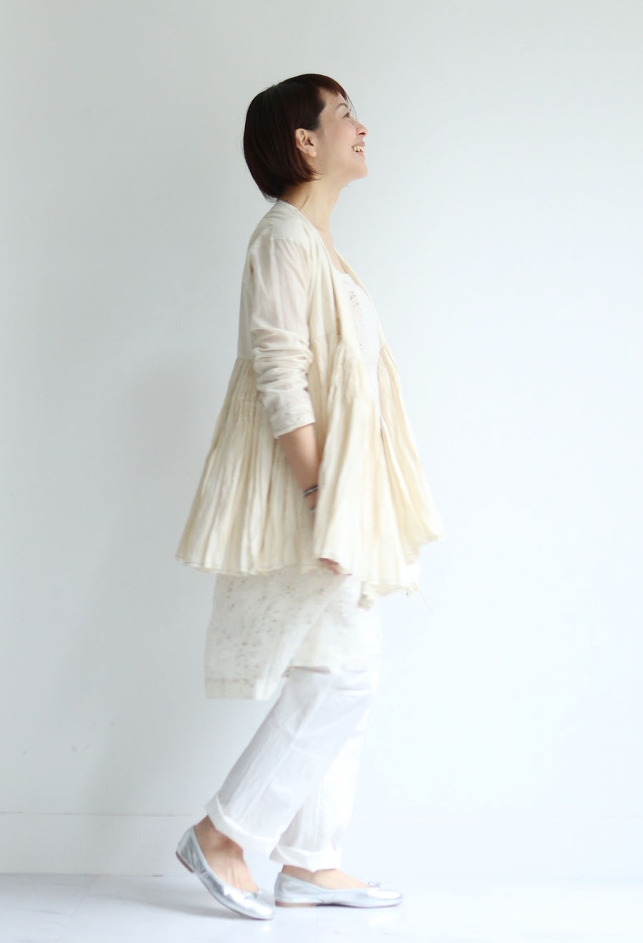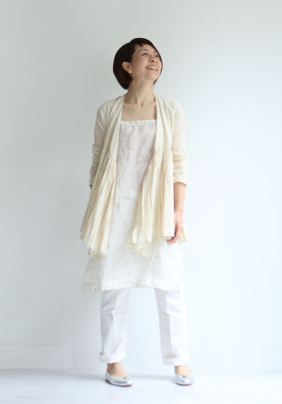見た目には、オフホワイトのようなお色目で、天然のコットンの風合いもよく出ていて、雰囲気のある色合わせや優しい印象のコーディネートに仕上がります。
