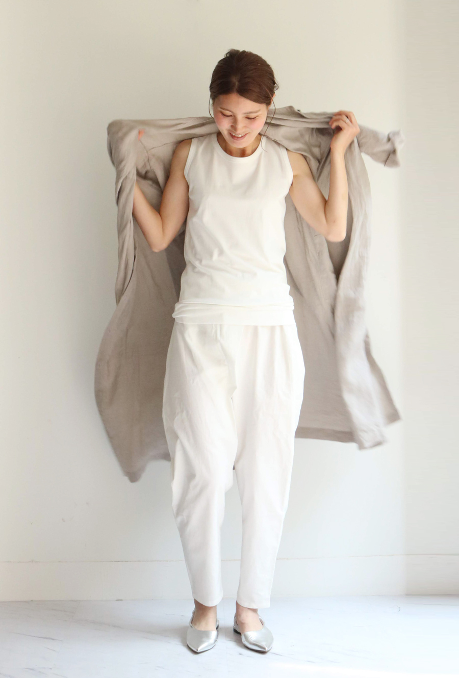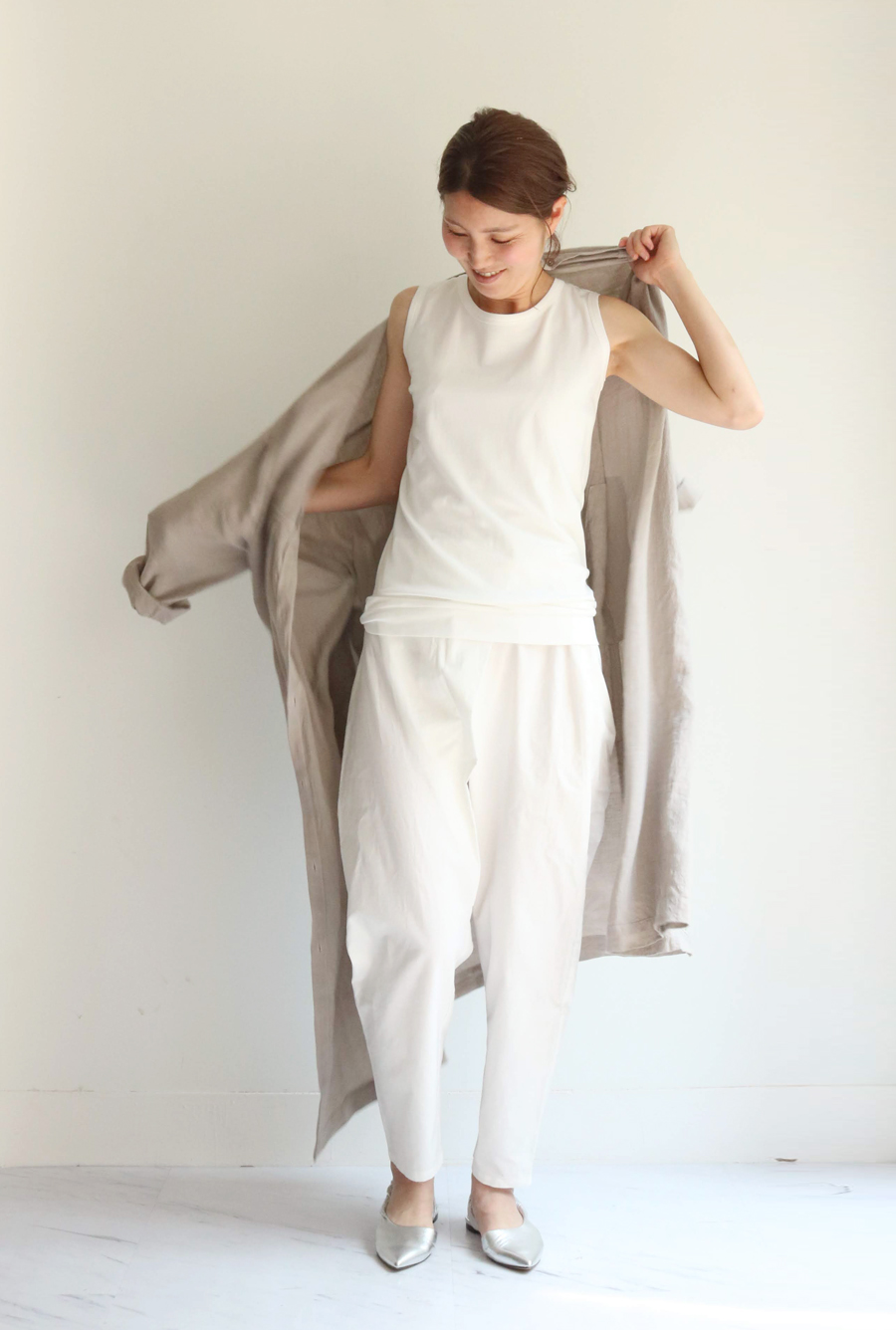 タンクトップにコットンパンツ。