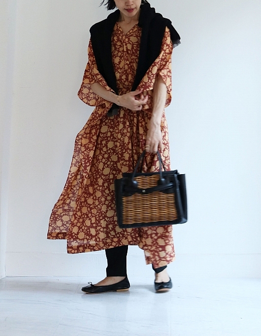 カーディガンは、冷房よけと花柄を落ち着かせるための必須アイテム。