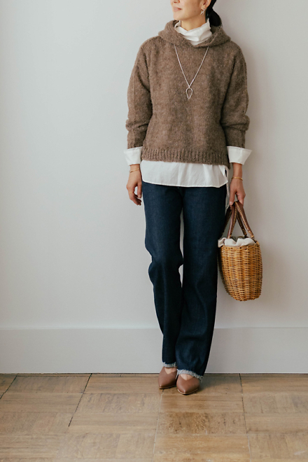 後ろ開きになっているので、ニットなどとの重ね着がスッキリと見え