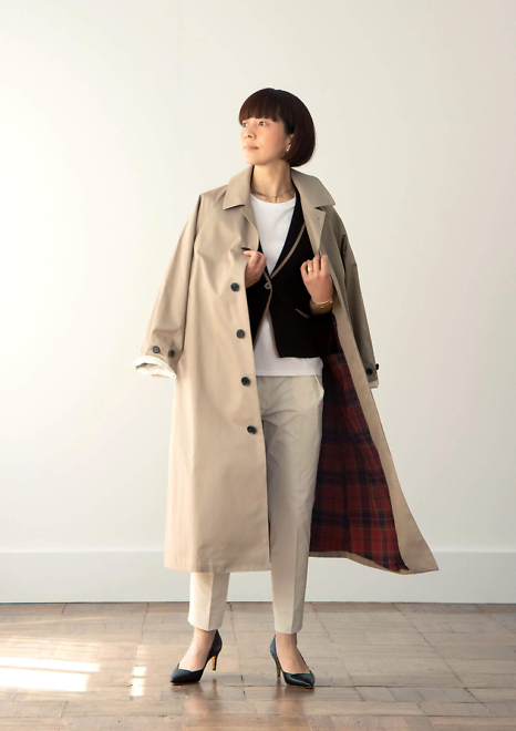「シェルブールコート ベージュ」は裏地のチェック柄が素敵なステンカラ―コートです。