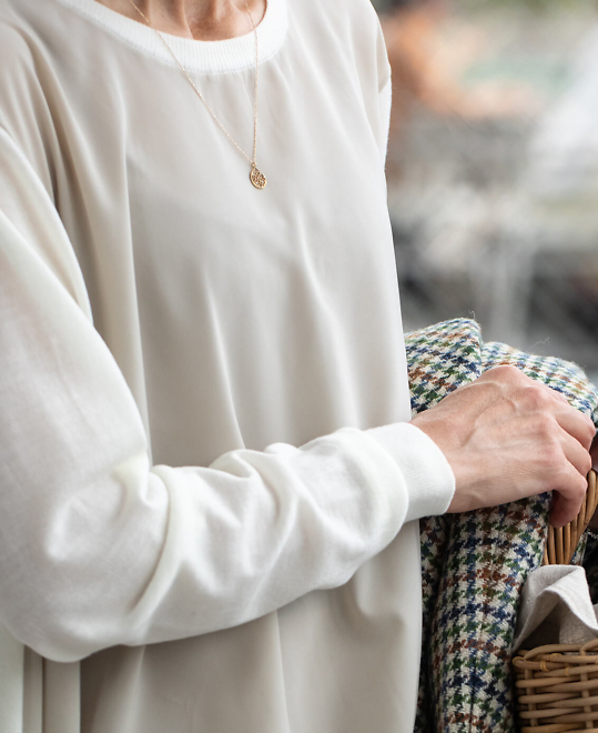 「ペニンシュラニット」は生地の切り替えが表情豊かなトップスです。
