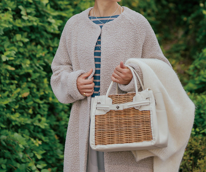 また「アロンジェコート」は襟がなくて、マフラーなどの小物使いがスッキリと